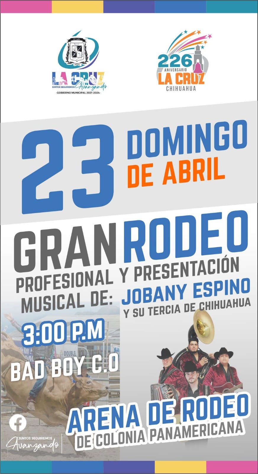 Mañana en punto de las 4 de la tarde se estará llevando a cabo el gran rodeo profesional a cargo de Bad Boy Rodeo C.O, donde se tendrá también la reinauguración de la arena de rodeo municipal recién remodelado por el alcalde, Profr Sergio Luis Olvera Gallegos.
