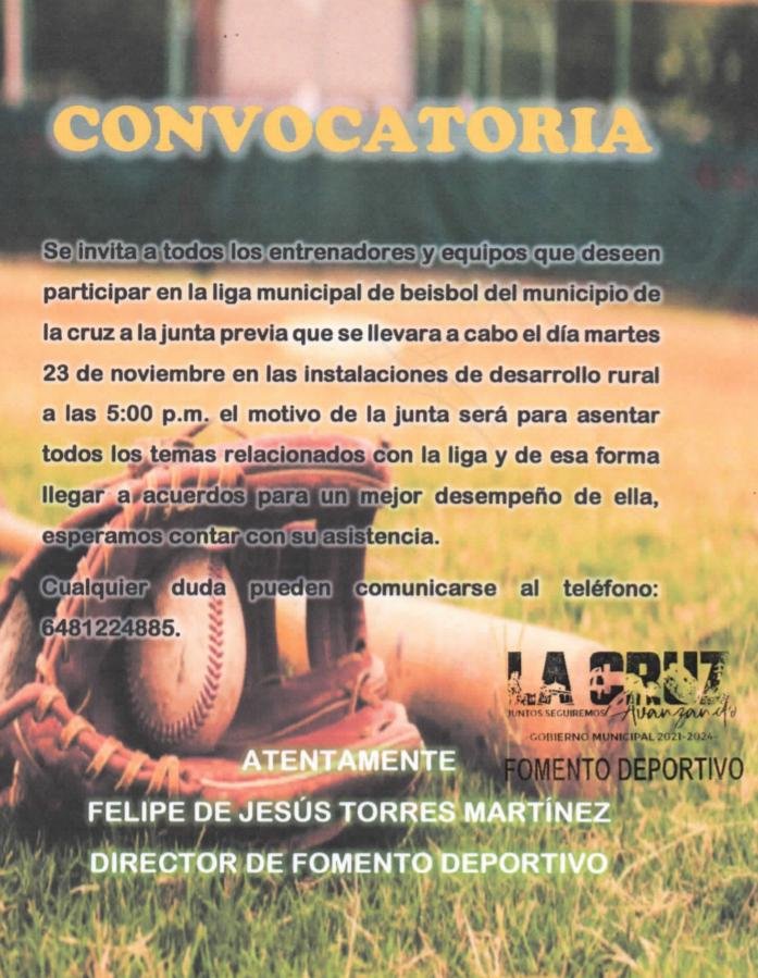 El día de mañana en punto de las 17:00 horas, se llevará a cabo la reunión previa al inicio de la liga Municipal de béisbol.