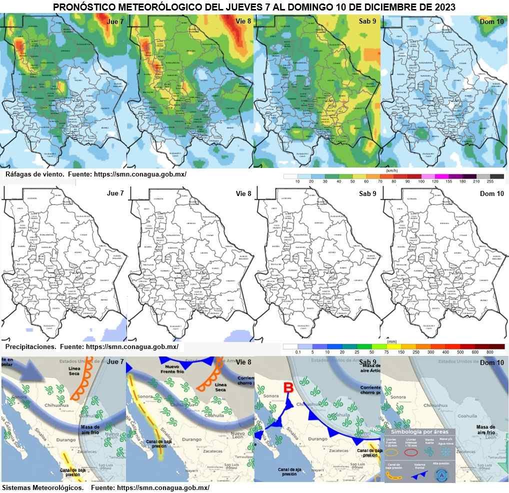 Según información emitida por el Sistema Meteorológico Nacional, los vientos serán de 5 a 20 kilómetros por hora (km/h), con rachas que podrían alcanzar los 55 km/h en partes de las zonas noroeste y centro como Janos, Madera, Ignacio Zaragoza y Majalca, mientras que superarán los 45 km/h en Ascensión, Casas Grandes, Nuevo Casas Grandes, Carichí, Cuauhtémoc y Chihuahua.