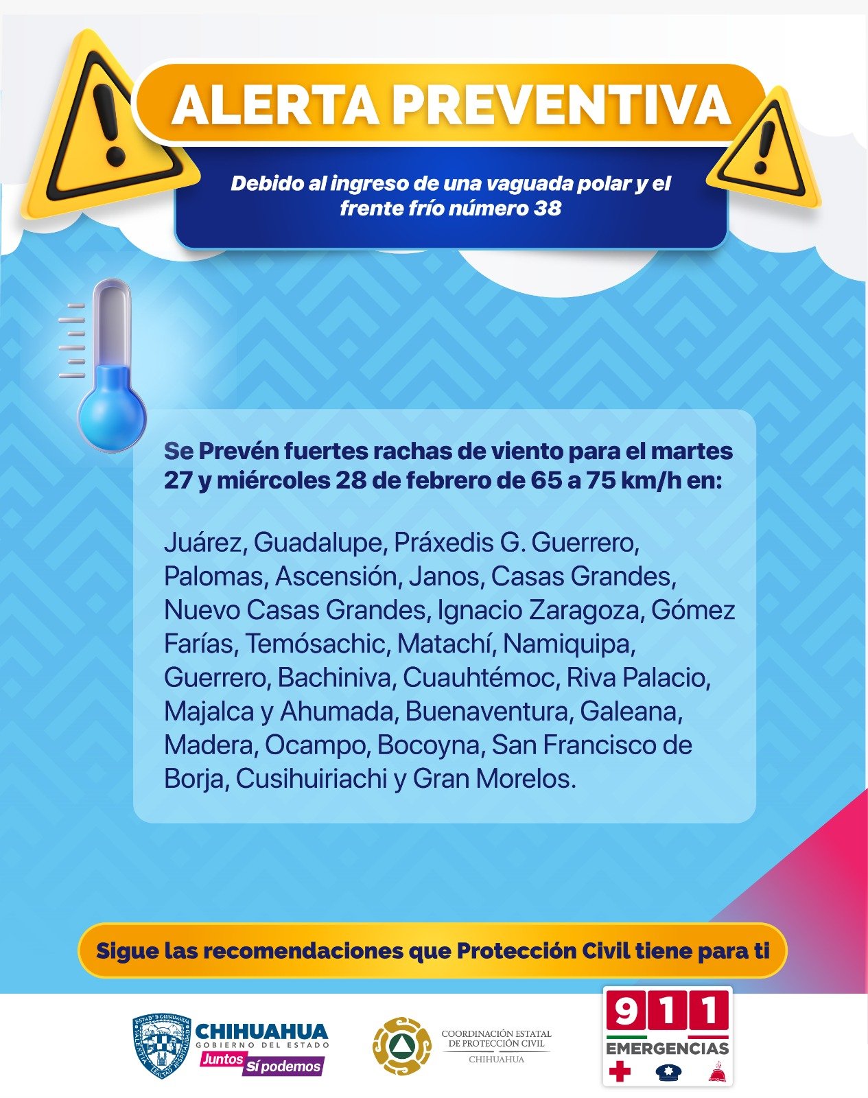 En el transcurso de este martes y miércoles, habrá vientos con rachas que podrían superar los 65 y 75 kilómetros por hora (km/h) en Guadalupe, Práxedis G. Guerrero, Ascensión, Janos, Casas Grandes, Nuevo Casas Grandes, Ignacio Zaragoza, Gómez Farías, Temósachic, Matachí y Namiquipa.