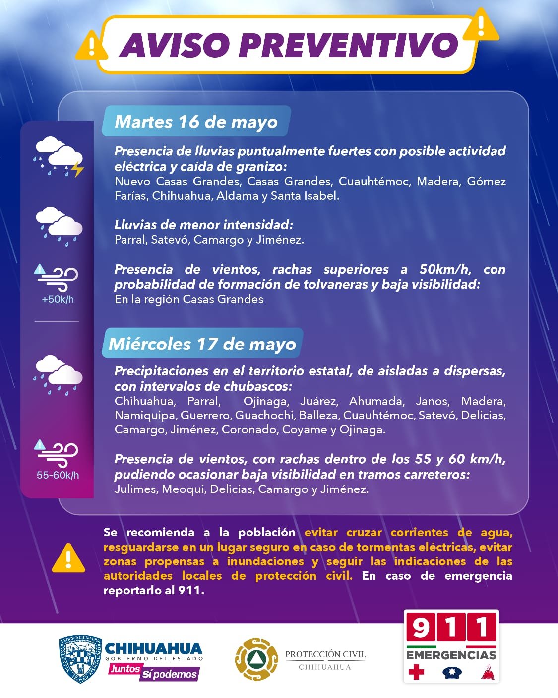 Para el miércoles 17 se esperan precipitaciones de aisladas a dispersas, con intervalos de chubascos en Chihuahua, Parral, Ojinaga, Juárez, Ahumada, Janos, Madera, Namiquipa, Guerrero, Guachochi, Balleza, Cuauhtémoc, Satevó, Delicias, Camargo, Jiménez, Coronado, Coyame y Ojinaga.