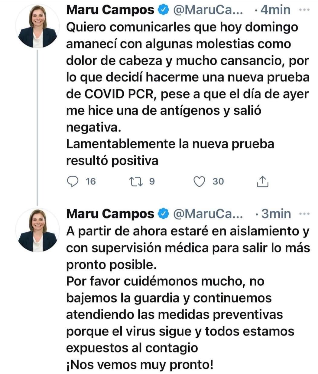 La gobernadora electa de Chihuahua, Maru Campos, dio positivo a una prueba PCR de coronavirus, anunció este domingo a través de sus redes sociales.