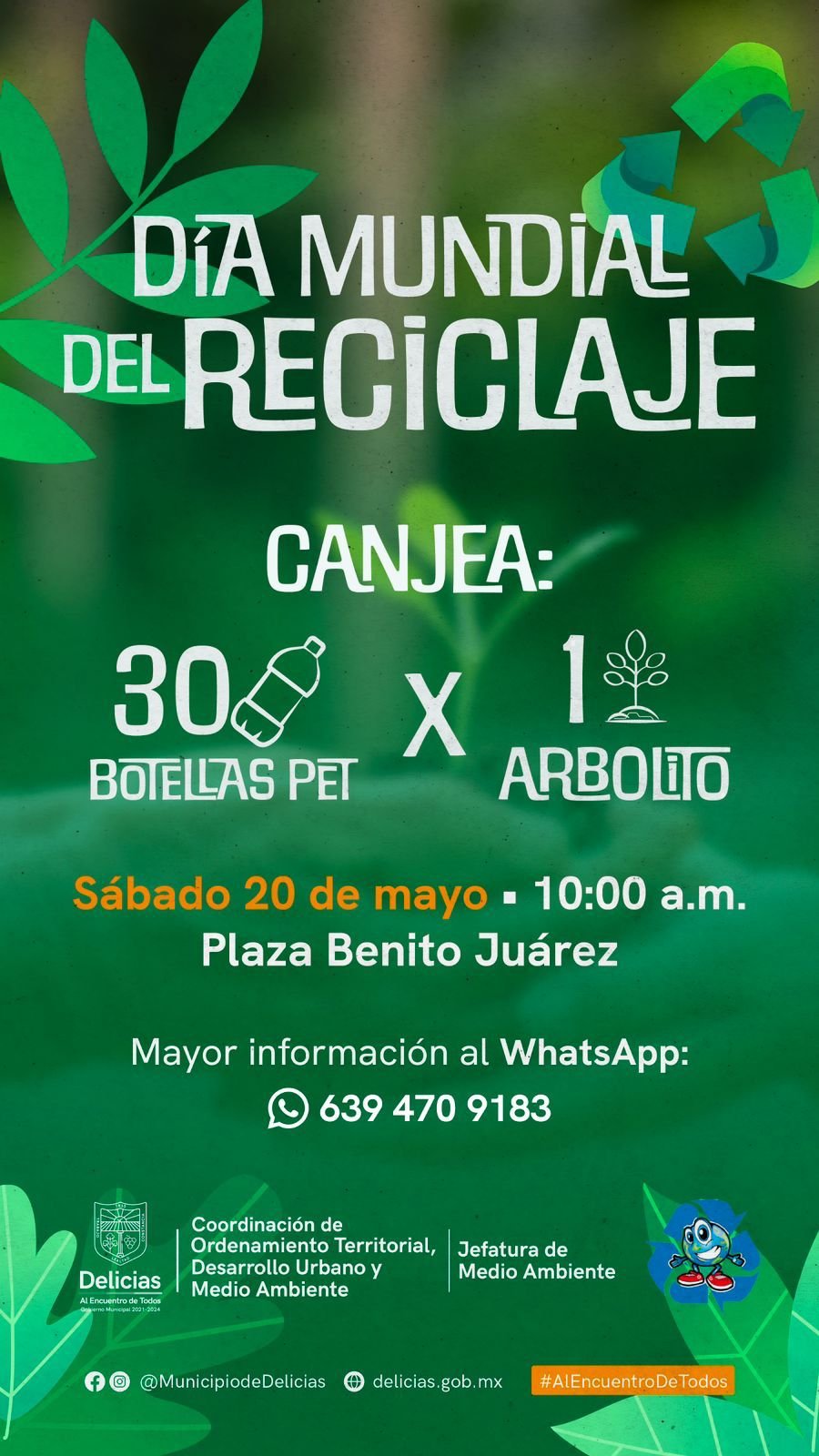 Por instrucción del Alcalde Jesús Valenciano, Juan Torrecillas, jefe de Medio Ambiente, llevará un evento de canje de 30 botellas pet por un arbolito, en conmemoración al Día del Reciclaje, en la Plaza Benito Juárez, el sábado 20 de mayo a las 10 de la mañana