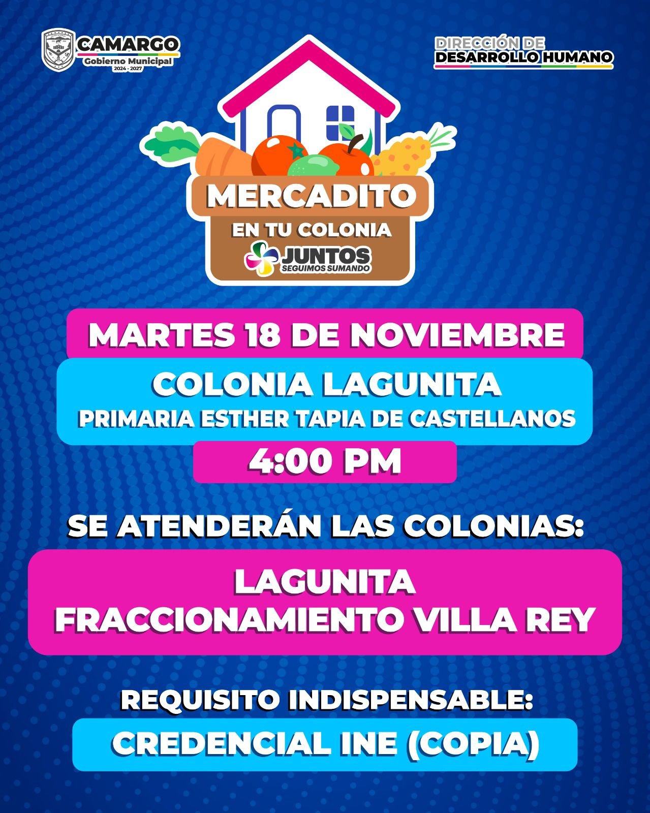El Gobierno Municipal de Camargo, a través de la Dirección de Desarrollo Humano, invita a las familias de las colonias Lagunita y Fraccionamiento Villa Rey a participar en una nueva edición del programa Mercadito en tu Colonia, una iniciativa que acerca productos de la canasta básica a precios accesibles.