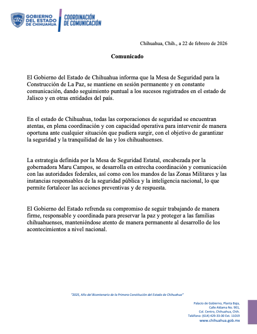 El Gobierno del Estado refrenda su compromiso de seguir trabajando de manera firme, responsable y coordinada para preservar la paz y proteger a las familias chihuahuenses, manteniéndose atento de manera permanente al desarrollo de los acontecimientos a nivel nacional.