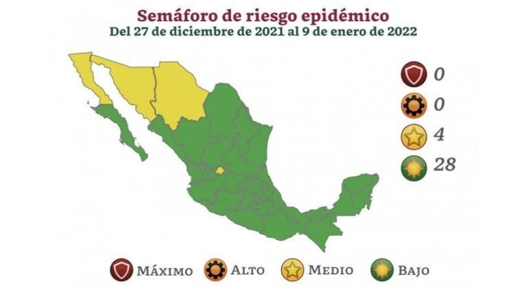 Específicamente, del lunes, 27 de diciembre, al domingo, 9 de enero, Baja California, Sonora, Chihuahua y Aguascalientes permanecerán en amarillo; todos los demás estados estarán en verde.