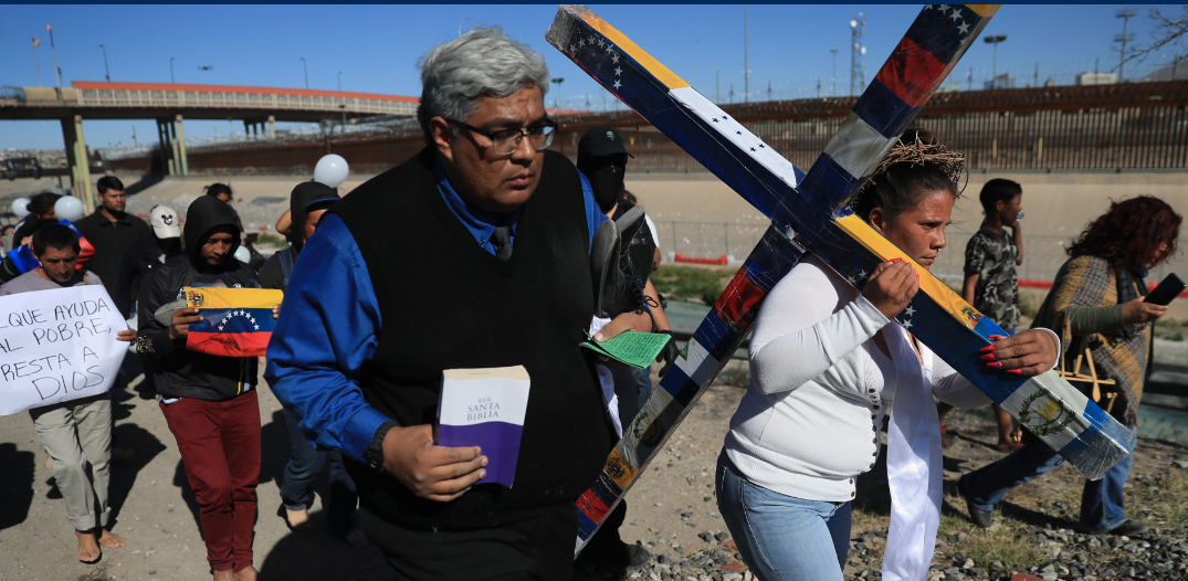 Los migrantes, en su mayoría venezolanos que se mantienen varados en esta ciudad fronteriza, participaron en la representación de la crucifixión de Cristo caminaron en caravana, en muchos casos se quitaron los zapatos para caminar descalzos y hasta llegar a las instalaciones del Instituto Nacional de Migración (INM), lugar donde ocurrió la tragedia.