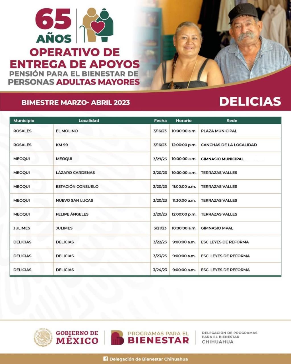 La oficina de Bienestar dio a conocer que en relación al pago del programa federal para los adultos mayores será el 27 de marzo en el Gimnasio Municipal de Meoqui.