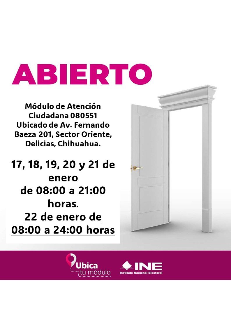 La 05 Junta Distrital Ejecutiva en Delicias, informó que el módulo del INE estará brindando atención este fin de semana.
