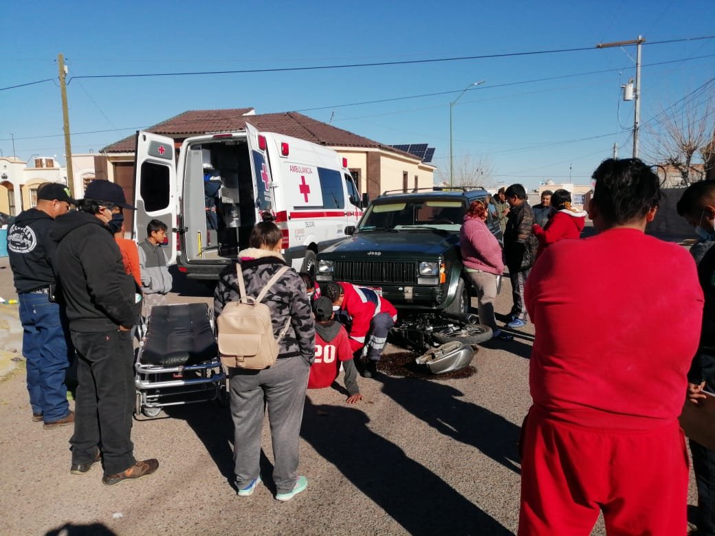 Fue en el cruce de la calle Cedro del Atlas y avenida Cipreses de Monterrey, donde el conductor de una motocicleta Italia, modelo 2006, color negra, no realizó el alto correspondiente y provocó ser embestido por la conductora de una camioneta Jeep, línea Cherokee, con matrículas ELH1799, color verde.