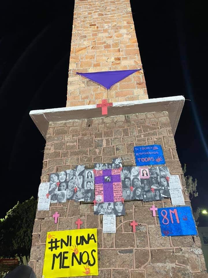 Fue por parte del movimiento feminista “Las Yucas” que se realizó esta actividad para colocar pañuelos morados, cruces con nombres y fotografías de mujeres que han sido asesinadas.