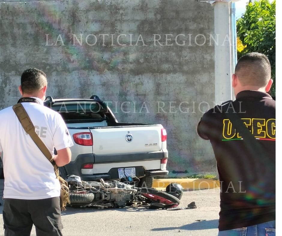 El choque fue entre la motocicleta de color negro y rines rojos en la que viajaba el occiso y una camioneta de la marca Dodge, linea Ram, color blanco con matrículas del estado de Chihuahua.
