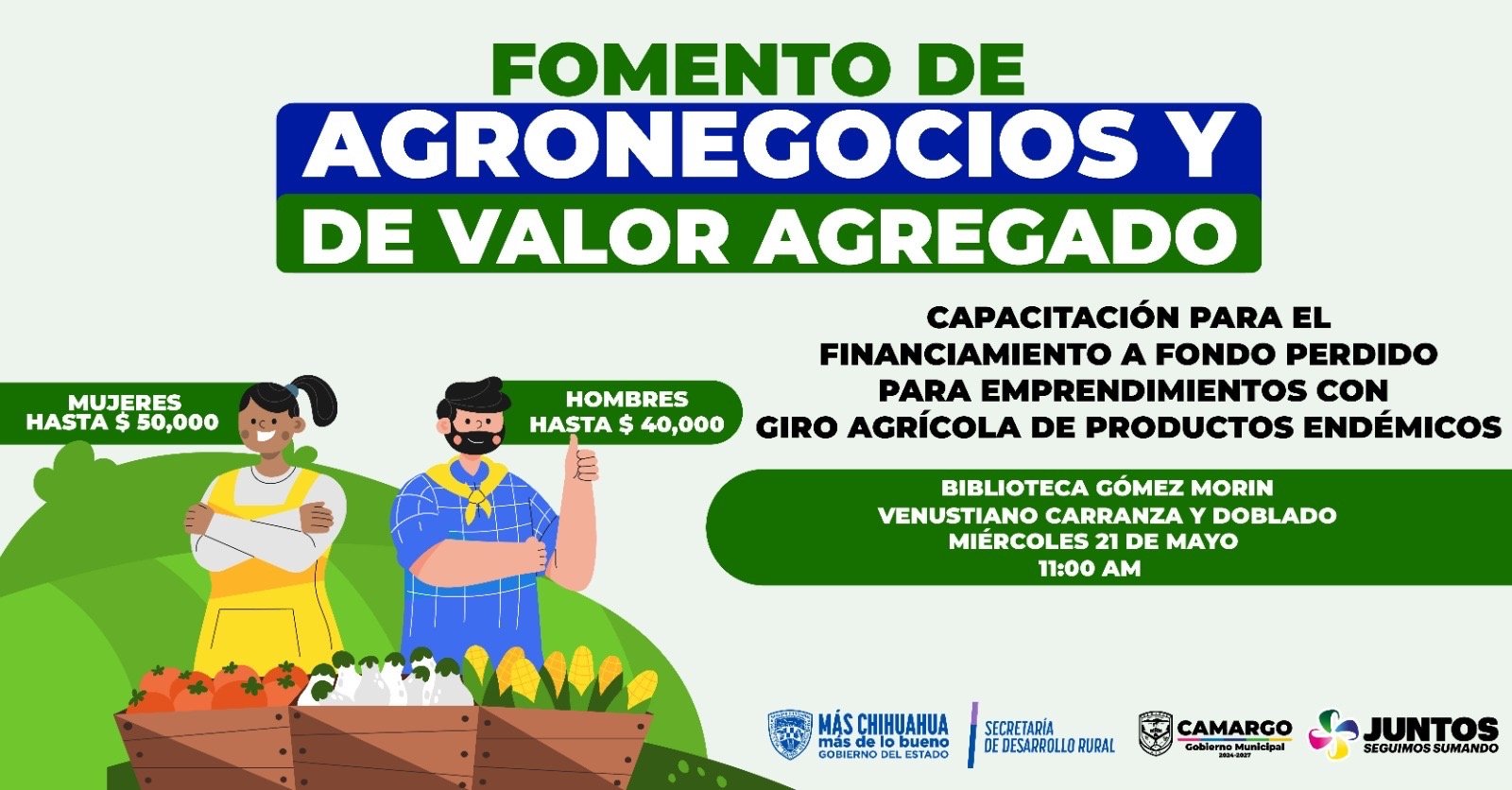El Gobierno Municipal de Camargo invita a productores, emprendedores y personas interesadas en desarrollar proyectos agrícolas a asistir a una capacitación enfocada en los pasos y requisitos para acceder a financiamiento a fondo perdido, especialmente para iniciativas que aprovechen productos endémicos y generen valor agregado.