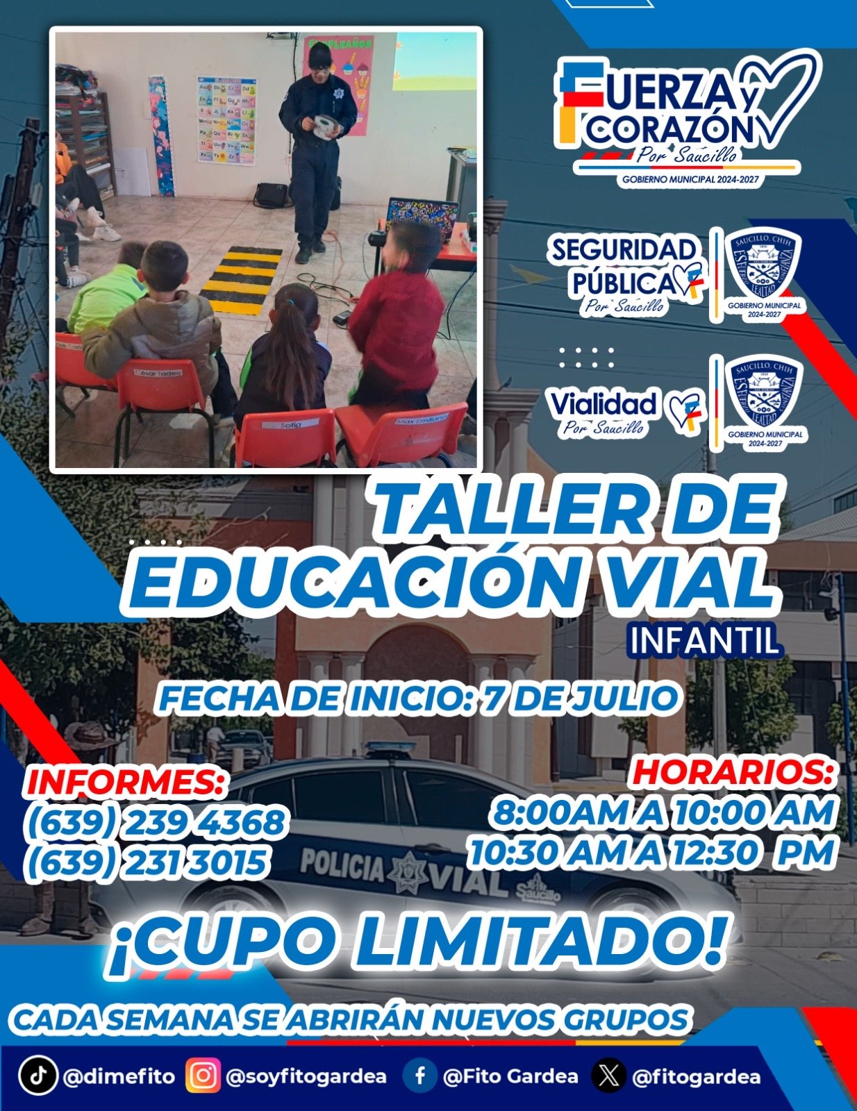 El presidente municipal Fito Gardea, a través del Departamento de Vialidad de la Dirección de Seguridad Pública, extiende una cordial invitación a padres de familia para inscribir a sus hijas e hijos en el Taller de Educación Vial Infantil, que dará inicio el próximo 7 de julio.