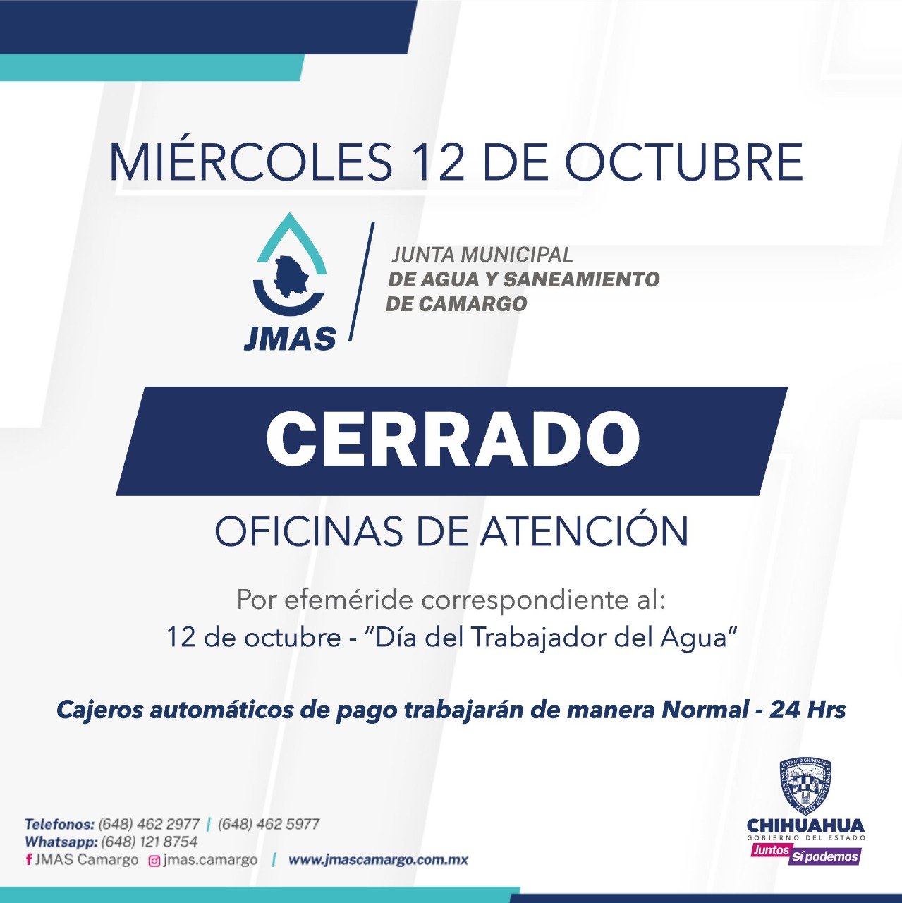 Las oficinas de la Junta Municipal de Agua y Saneamiento de Camargo permanecerán cerradas este próximo 12 de octubre.