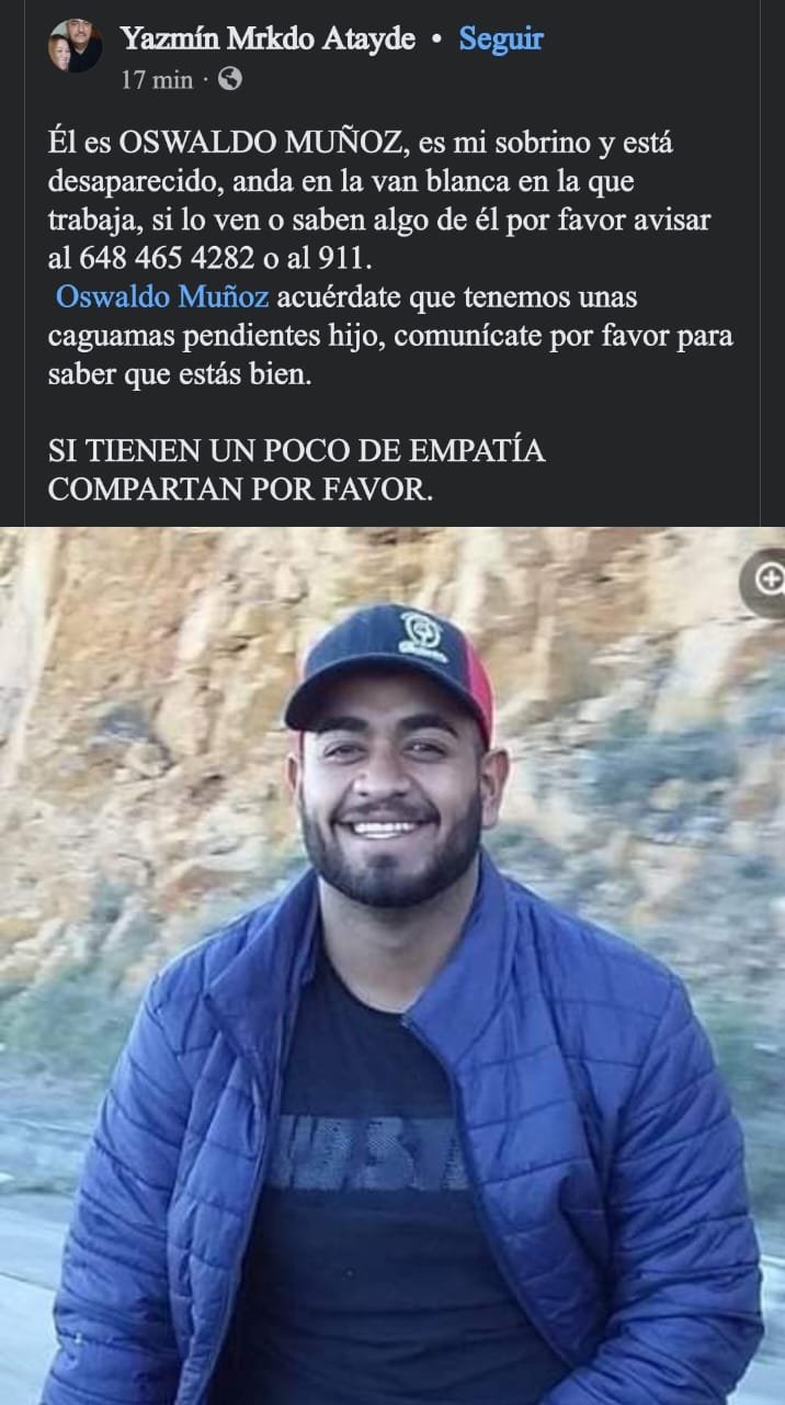 Lo último que saben de el es que circula en una Van blanca del negocio de sus padres “Frutería Muñoz” y escribió en su Facebook un mensaje donde se despedía de su familia.