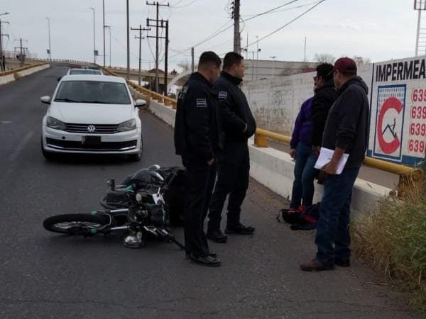 Por no medir la distancia de seguridad, un motociclista chocó con un automóvil en el puente de la avenida Río Florido, en el municipio de Delicias.