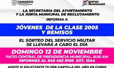 El Gobierno Municipal a través de la Secretaría del Ayuntamiento informa que el sorteo del Servicio Militar será este domingo 12 de noviembre. El evento será...