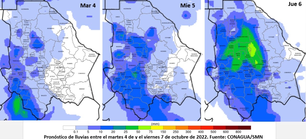 Batopilas, Guachochi, Morelos, Guadalupe y Calvo y Balleza esperan una captación de hasta 25 milímetros de lluvias, por lo que es la región del estado con la mayor expectativa de lluvia durante hoy.