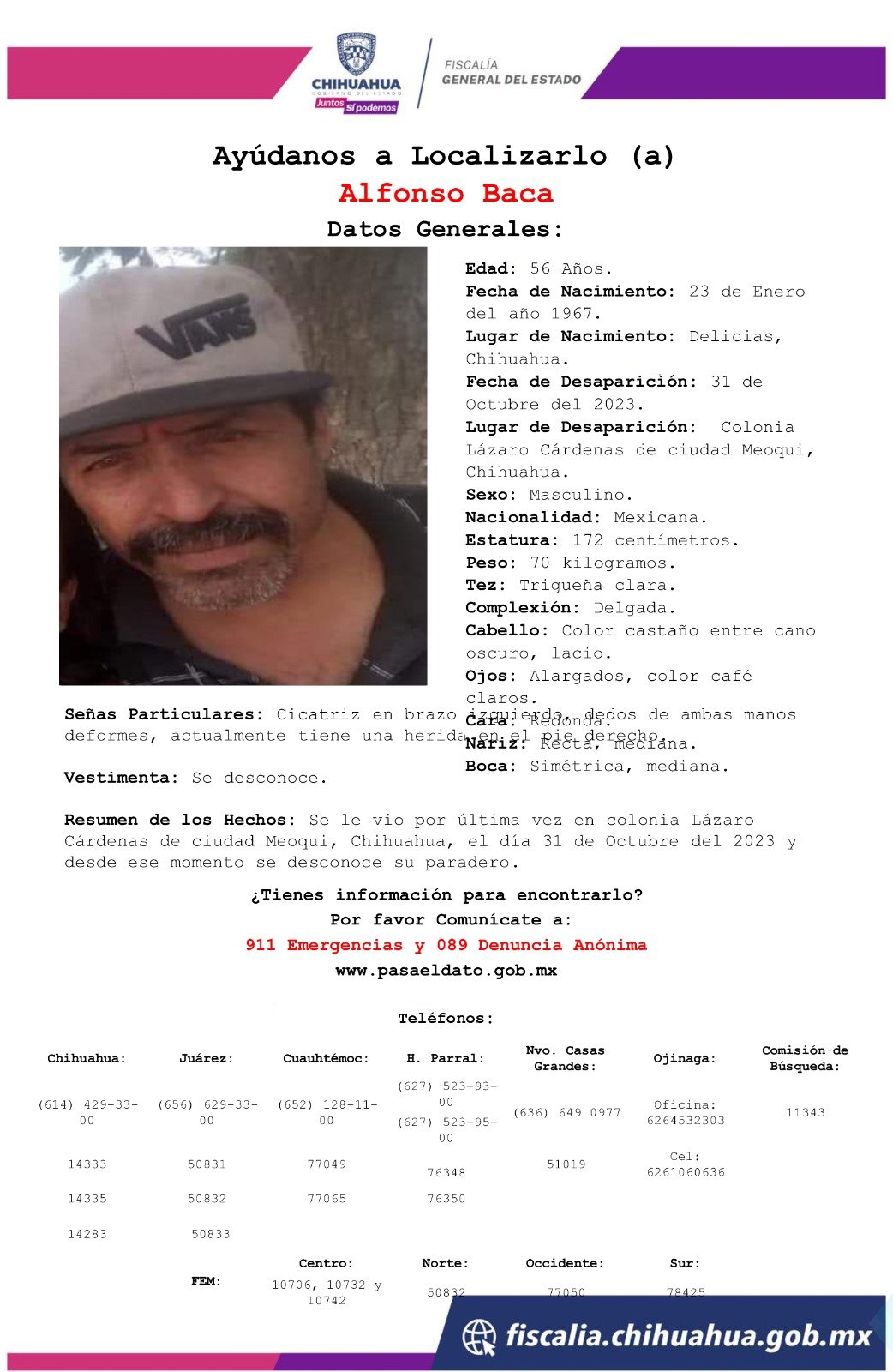 La Fiscalía General del Estado pide el apoyo de la ciudadanía para dar con el paradero del señor Alfonso Baca, quien desapareció el pasado 31 de octubre del presente año.