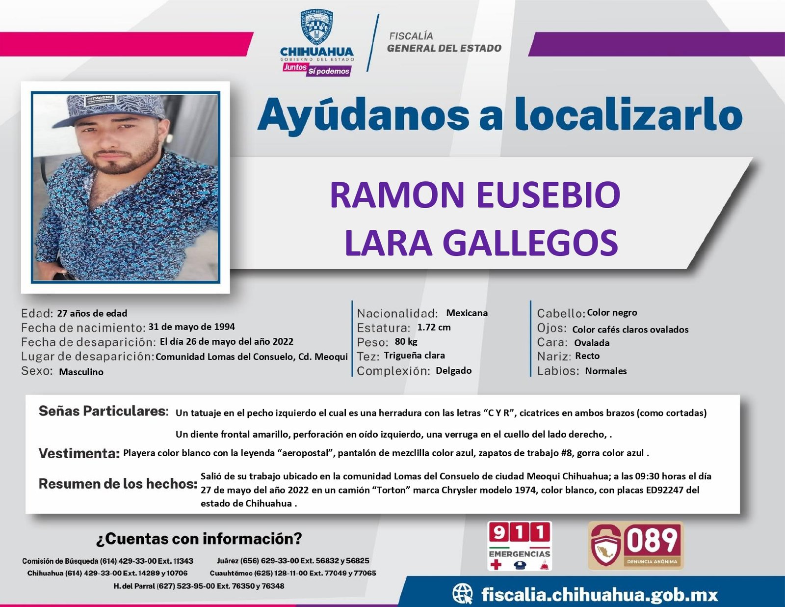 La Fiscalía General del Estado solicitó el apoyo de la ciudadanía para localizar a Ramón Eusebio Lara Gallegos, de 27 años de edad.