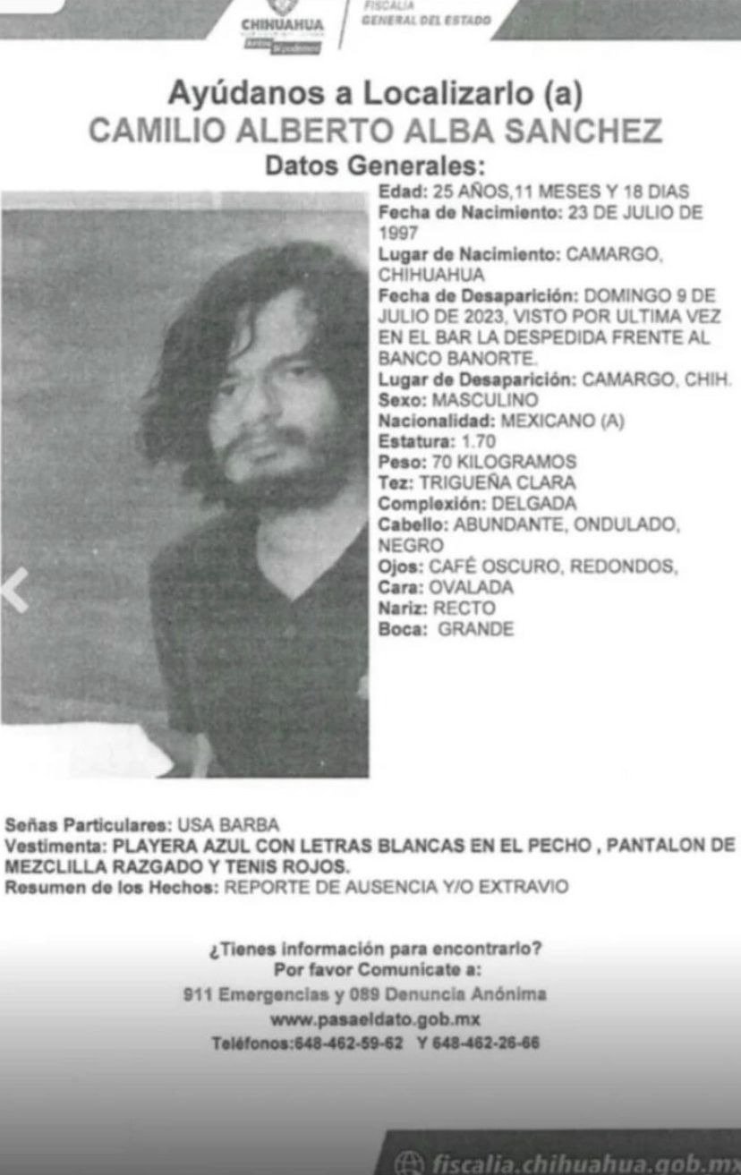 La Fiscalía General del Estado solicitó el apoyo de la ciudadanía para localizar al joven Camilio Alberto Alba Sánchez, de 25 años de edad, quien desapareció en el municipio de Camargo.