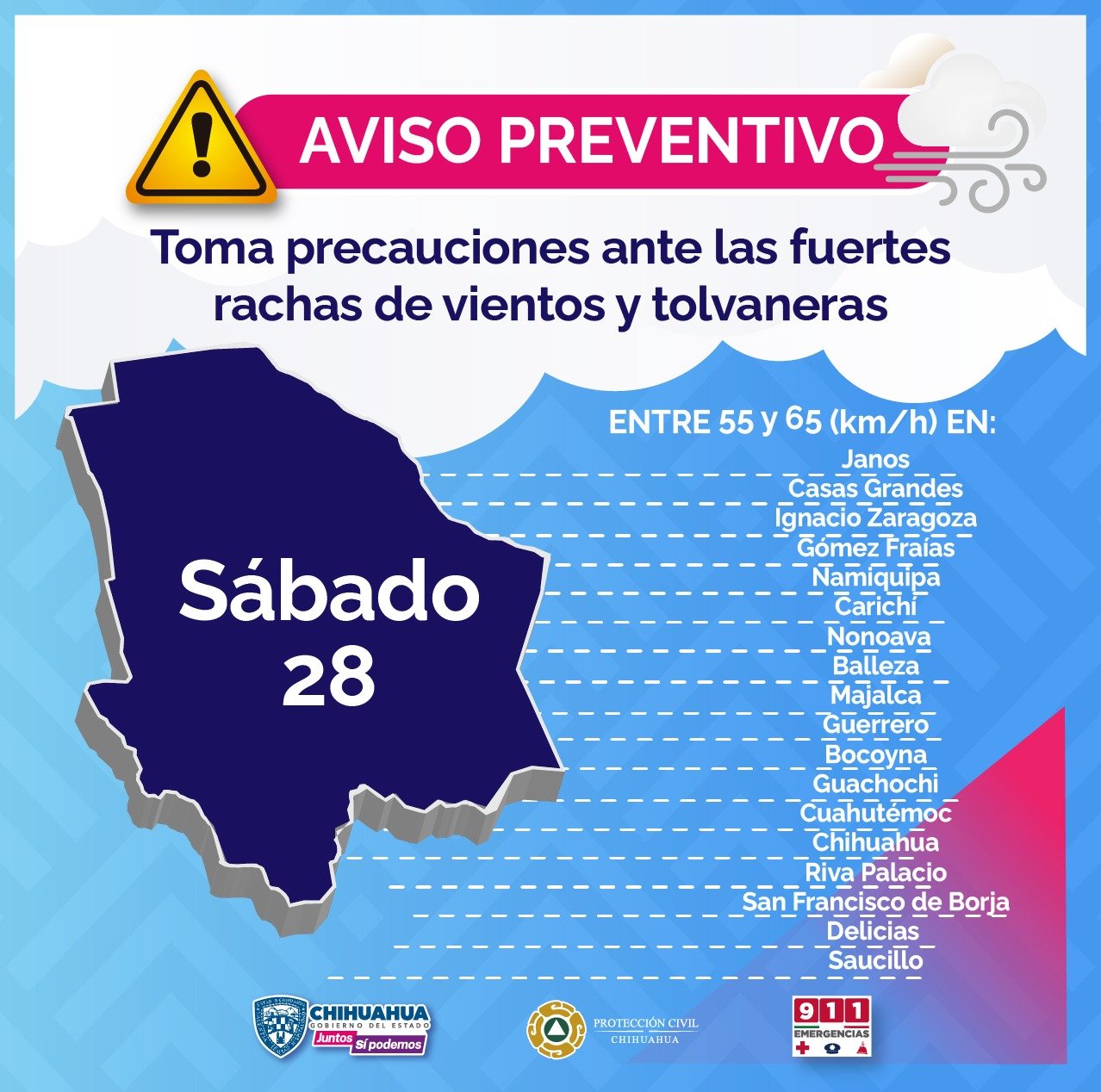 Según el pronóstico emitido por el Servicio Meteorológico Nacional, la CEPC indicó que para este sábado 28 y domingo 29, se esperan rachas de viento que pueden oscilar entre los 55 y 65 kilómetros por hora (km/h) principalmente en Janos, Casas Grandes, Ignacio Zaragoza, Gómez Farías, Namiquipa, Carichí, Nonoava, Balleza, Majalca, Nuevo Casas Grandes, Madera, Guerrero, Bocoyna, Guachochi, Cuauhtémoc, Chihuahua, Riva Palacio, San Francisco de Borja, Delicias y Saucillo.