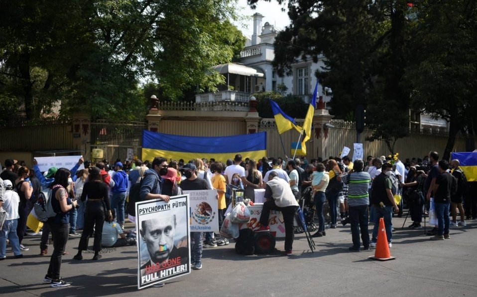 Ucranianos que habitan en la Ciudad de México protestan por tercer día frente a la embajada de Rusia en México, ubicada en la avenida Circuito Interior José Vasconcelos y Benjamín Hill, en la colonia Hipódromo Condesa, alcaldía Cuauhtémoc, tras la invasión a su país.