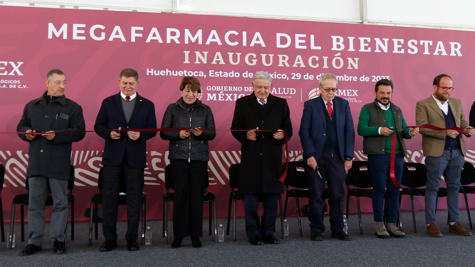Acompañaron al presidente al corte del listón inaugural de la Megafarmacia para el Bienestar: el secretario de Salud, Jorge Alcocer Varela; el subsecretario de Prevención y Promoción de la Salud, Ruy López Ridaura; el subsecretario de Egresos de la Secretaría de Hacienda y Crédito Público, Juan Pablo de Botton Falcón; los directores generales del Instituto Mexicano del Seguro Social, Zoé Robledo Aburto; de Laboratorios de Biológicos y Reactivos de México S.A. de C.V. (BIRMEX), Jens Pedro Lohmann Iturburu; del Instituto de Seguridad y Servicios Sociales de los Trabajadores del Estado, Pedro Zenteno Santaella; del IMSS Bienestar, Alejandro Calderón Alipi, y de la Comisión Federal para la Protección contra Riesgos Sanitarios (COFEPRIS), Alejandro Svarch Pérez; la directora de Administración y Finanzas del Instituto de Seguridad y Servicios Sociales de los Trabajadores del Estado, Almendra Lorena Ortiz Genis; la directora de Control de Calidad de BIRMEX, Cristian Mary Corona Suárez y la directora de logística de BIRMEX, Alejandra Giselle Bolado Jiménez.