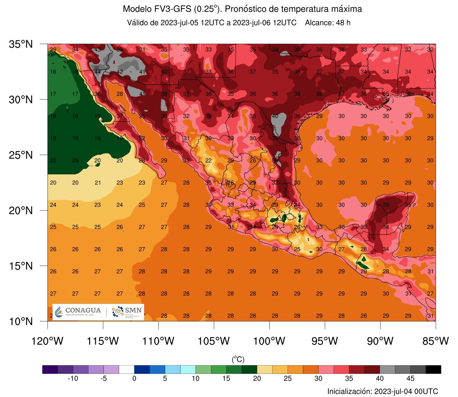 Para el miércoles 5 de julio, el termómetro se mantendrá en los 38 y 39°C en zonas de la región fronteriza, como Juárez, Ojinaga y Janos; en la región centro sur se esperan máximas por encima de los 30°C.