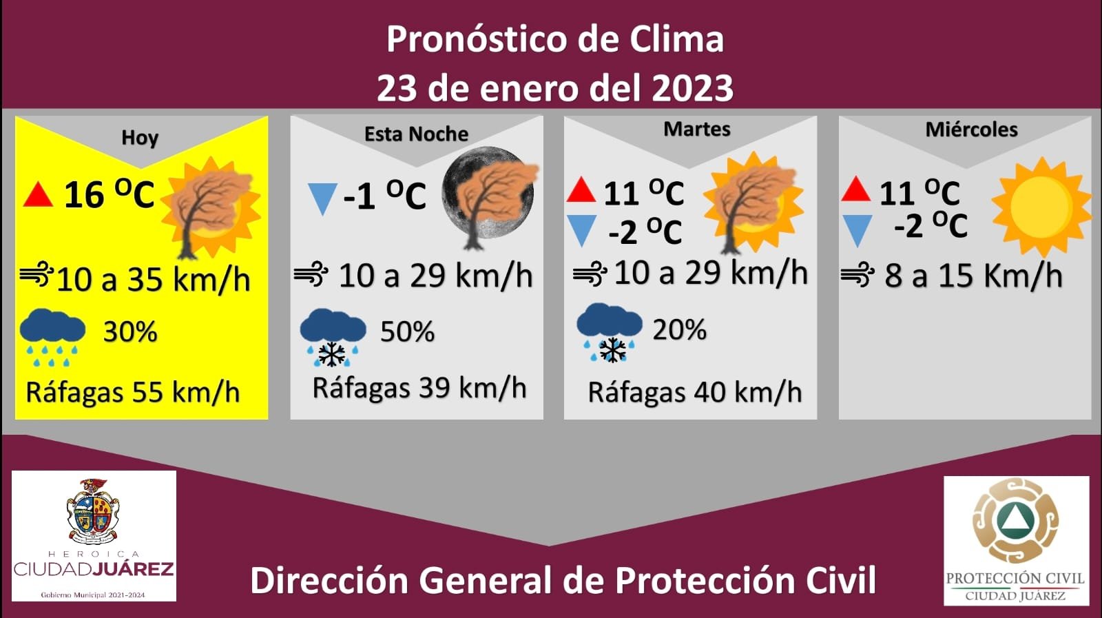 Para hoy se espera una temperatura máxima de 16 °C y mínima de -1, la velocidad del viento oscilará de 10 a 35 kilómetros por hora.