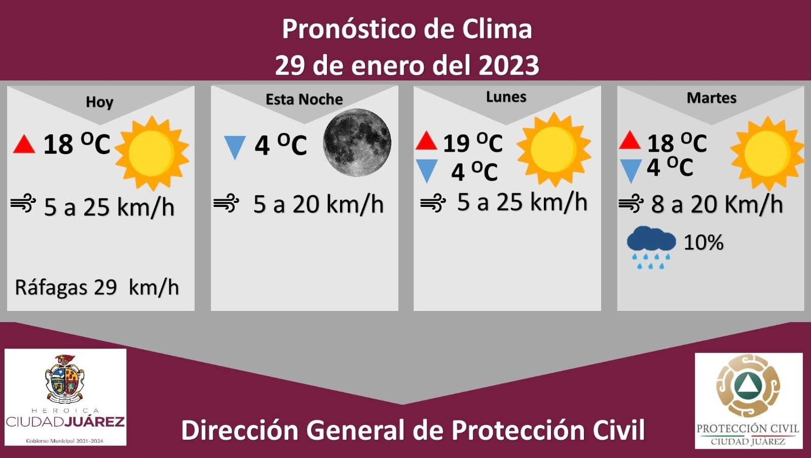 La Dirección General de Protección Civil, con base en informes del Servicio Meteorológico Nacional, pronostica un domingo soleado con una temperatura máxima de 18 grados Celsius, en tanto que la mínima será de 4 °C, además se esperan ráfagas de viento que podrían alcanzar los 29 kilómetros por hora.