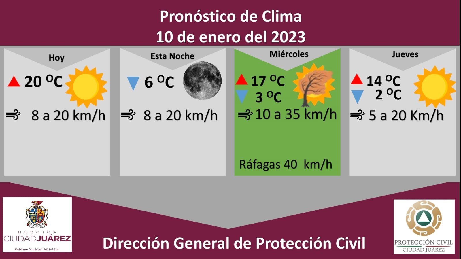 Roberto Briones Mota, titular de la dependencia, dijo que se espera que la velocidad del viento sea de 8 a 20 kilómetros por hora. Para mañana miércoles se emitirá una alerta verde debido a ráfagas de viento que alcanzarán los 40 kilómetros por hora, la temperatura máxima será de 17 °C en tanto que la mínima se pronostica en 3 °C por la noche, se espera un día soleado con vientos de 10 a 35 kilómetros por hora.