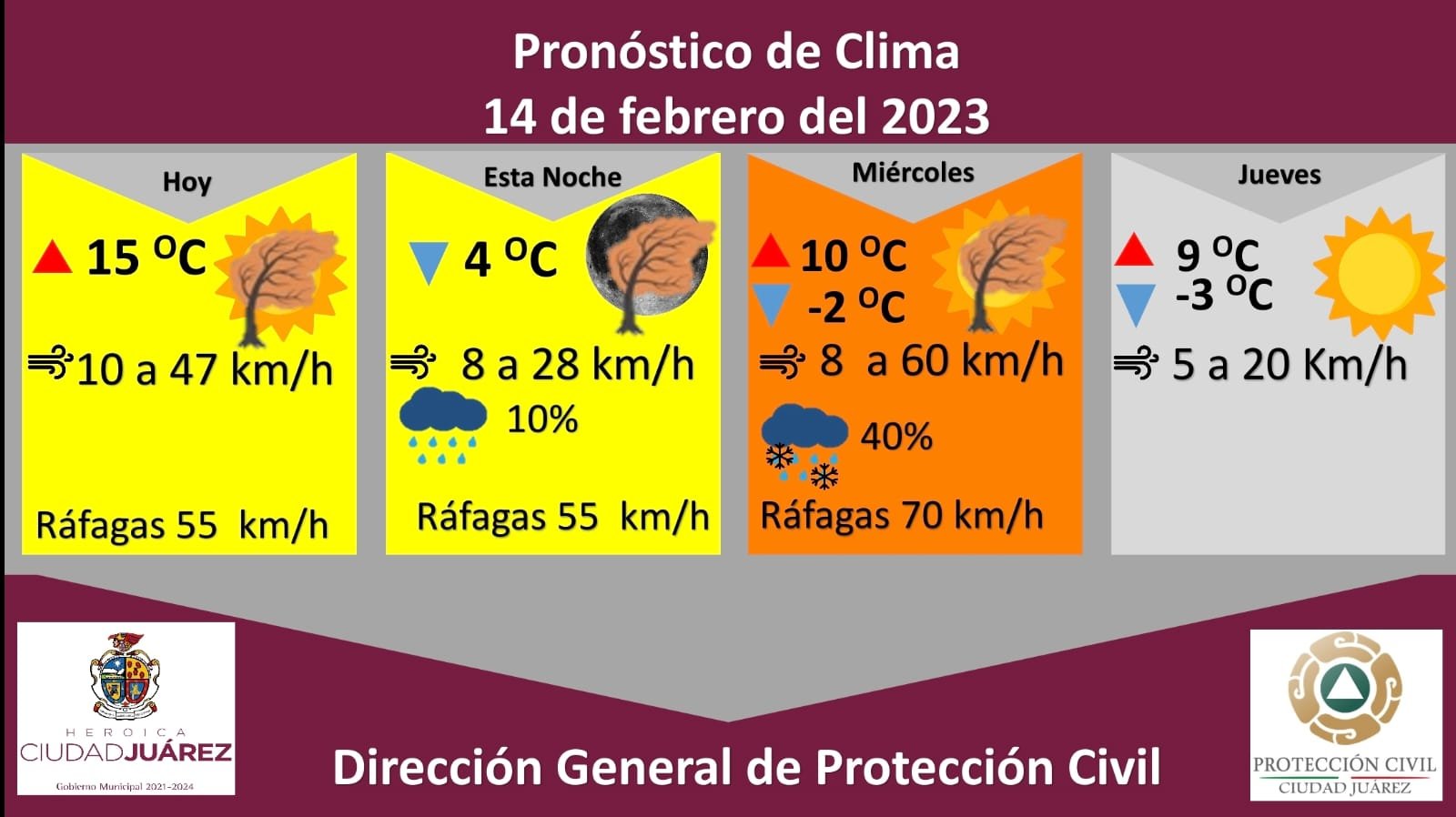La Dirección General de Protección Civil, con base en informes del Servicio Meteorológico Nacional, emite alerta amarilla para este martes debido a fuertes ráfagas de viento que podrían alcanzar los 55 kilómetros por hora, además existe un 10 por ciento de probabilidad de lluvia para esta tarde o noche.