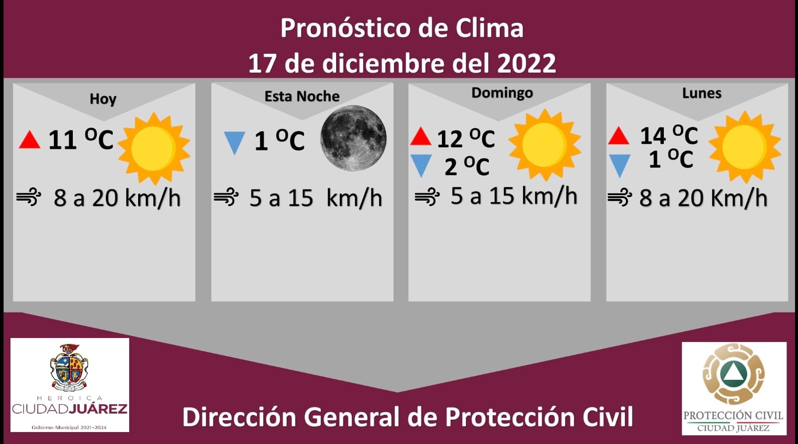 El lunes se espera un día soleado con una temperatura máxima de 14 °C y mínima de 1 °C, la velocidad del viento se pronostica de 8 a 20 kilómetros por hora.
