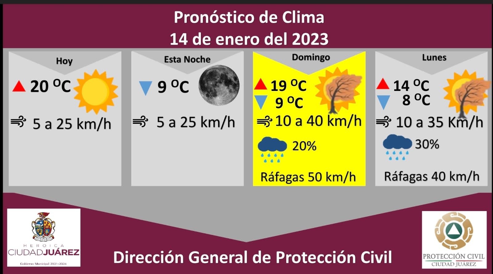 La Dirección General de Protección Civil, con base en informes del Servicio Meteorológico Nacional, pronostica una temperatura máxima de 20 grados Celsius para este sábado, en tanto que la mínima será de 9 °C por la noche.
