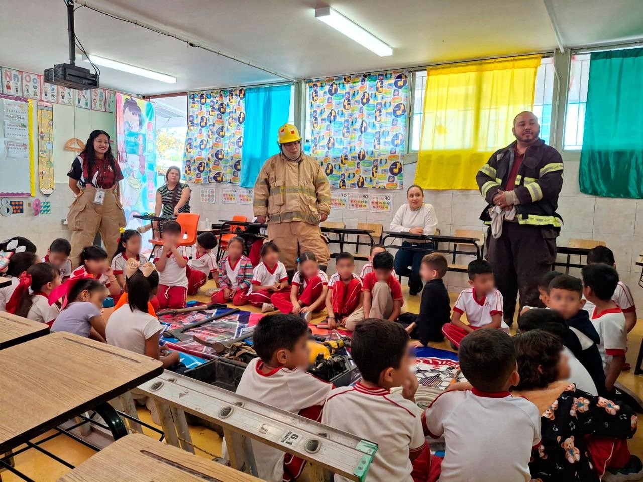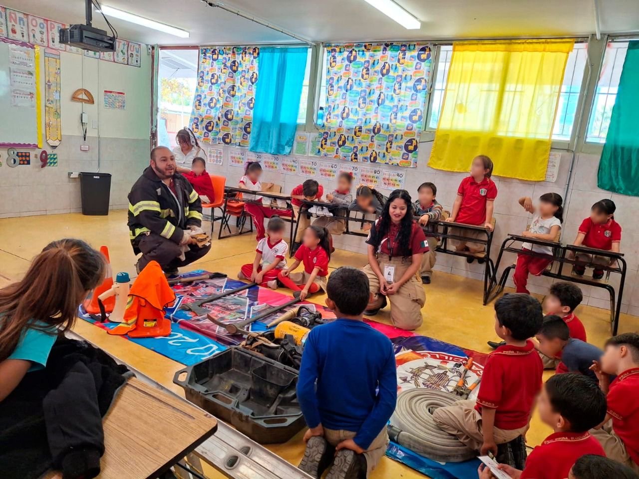 Durante la jornada, elementos del Cuerpo de Bomberos de Saucillo mostraron su equipo de protección personal y explicaron a los alumnos las funciones y responsabilidades que desempeñan durante su servicio, despertando el interés y la admiración de los niños por esta labor esencial.