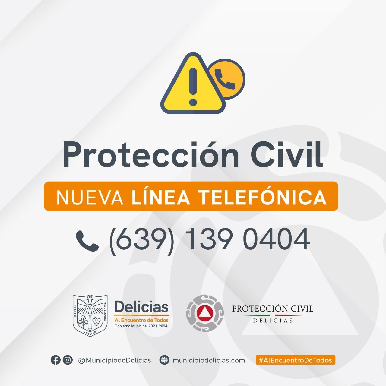 Con el objetivo de brindar mayor atención a la ciudadanía y con el cambio al nuevo domicilio de las oficinas de Protección Civil Delicias, ubicadas en el Complejo de Seguridad Pública, el número telefónico de esta dependencia cambió al 639 139 0404, para uso exclusivo de la ciudadanía.