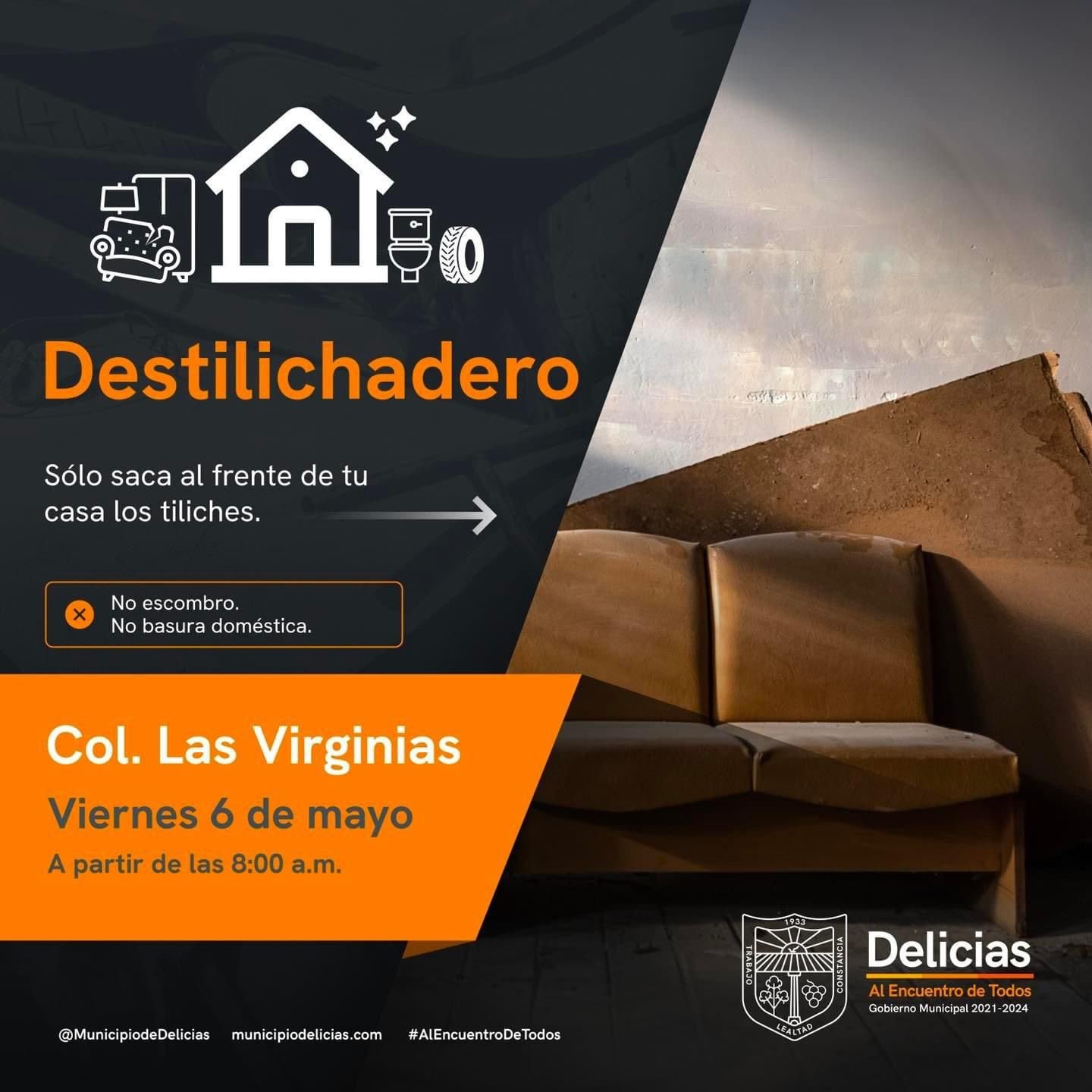 Continuando con el programa Destilichadero en pro de mantener una ciudad más limpia, Presidencia Municipal de Delicias a través de la dirección de Servicios Públicos, informa que el programa Destilichadero se llevará a cabo en la colonia Las Virginias el próximo viernes 06 de mayo.