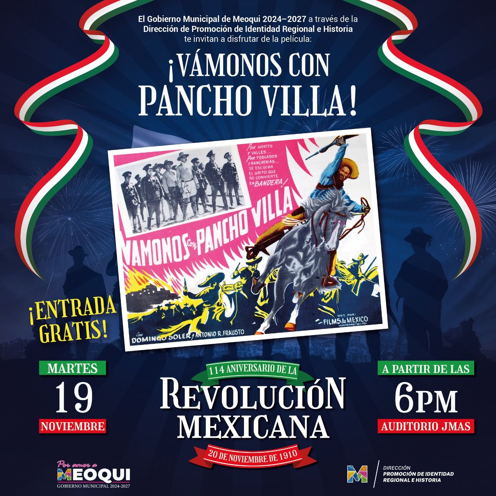 Con motivo de las festividades del 114 Aniversario del Inicio de la Revolución Mexicana, en Meoqui, este martes 19 de noviembre se llevará a cabo la proyección de la película “Vámonos con Pancho Villa” en el Auditorio de la JMAS a las 6, la cual retrata las hazañas de Los Leones de San Pablo, grupo revolucionario meoquense que peleó al lado de Pancho Villa en la guerra de Revolución.