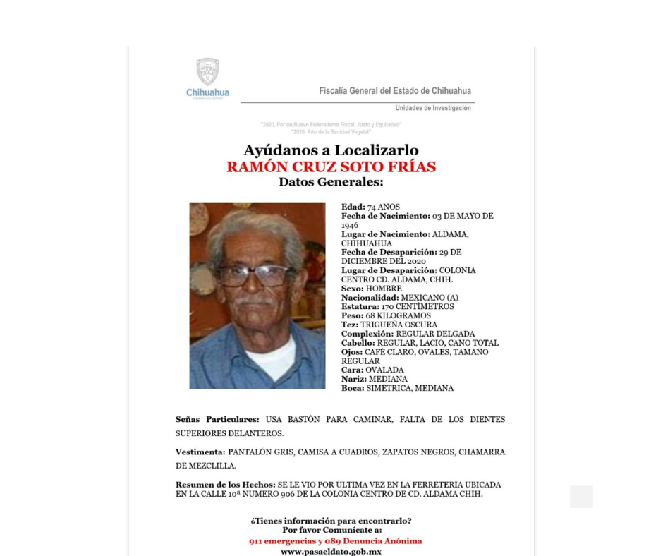 La Fiscalía de Distrito Zona Centro, lleva a cabo investigaciones de búsqueda para localizar a una persona de nombre Ramón Cruz Soto Frías, quién fue visto por última vez ayer martes 29 de diciembre, en una ferretería ubicada en el municipio de Aldama.