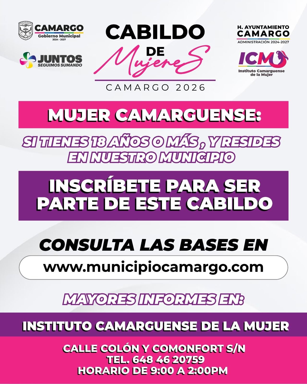 El Gobierno Municipal de Camargo, a través del Instituto Camarguense de la Mujer, invita a las mujeres camarguenses a formar parte del primer Cabildo de Mujeres, un espacio de participación que busca fortalecer la voz, las ideas y las propuestas de las mujeres en la vida pública del municipio.