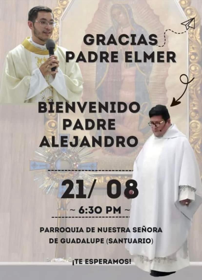 En el marco del 26 Aniversario de fundación como Parroquia, el Padre Carlos Barrio Reza, Párroco en la Parroquia de Nuestra Señora de Guadalupe, invitó a todos los fieles a unirse a dar la bienvenida al Padre Alejandro y dar gracias a Dios por el servicio prestado del Padre Elmer Eduardo Navarro Rubio, quien por el espacio de un año estuvo colaborando como Vicario en esta Parroquia.
