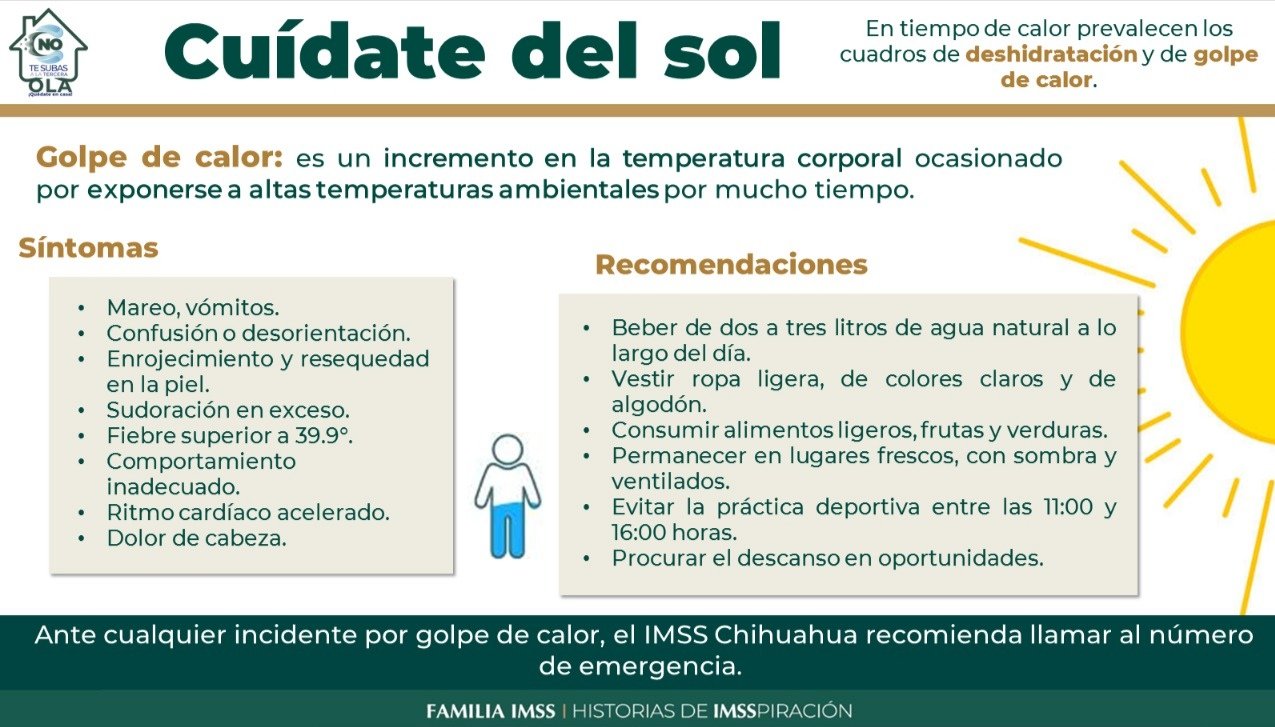 El Instituto Mexicano del Seguro Social (IMSS) Chihuahua exhorta a la población a que en esta temporada se proteja del golpe de calor, que ocurre cuando la temperatura corporal supera los 40 grados centígrados.