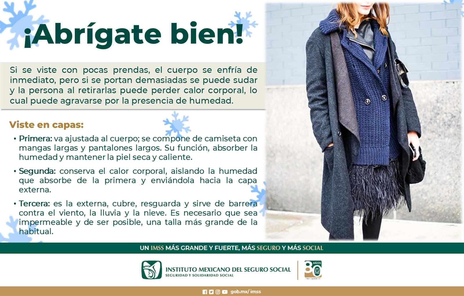 En esta temporada de frío el Instituto Mexicano del Seguro Social (IMSS) en Chihuahua exhorta a la población extremar precauciones, por lo que recomienda usar varias capas de ropa para mantener el calor corporal.