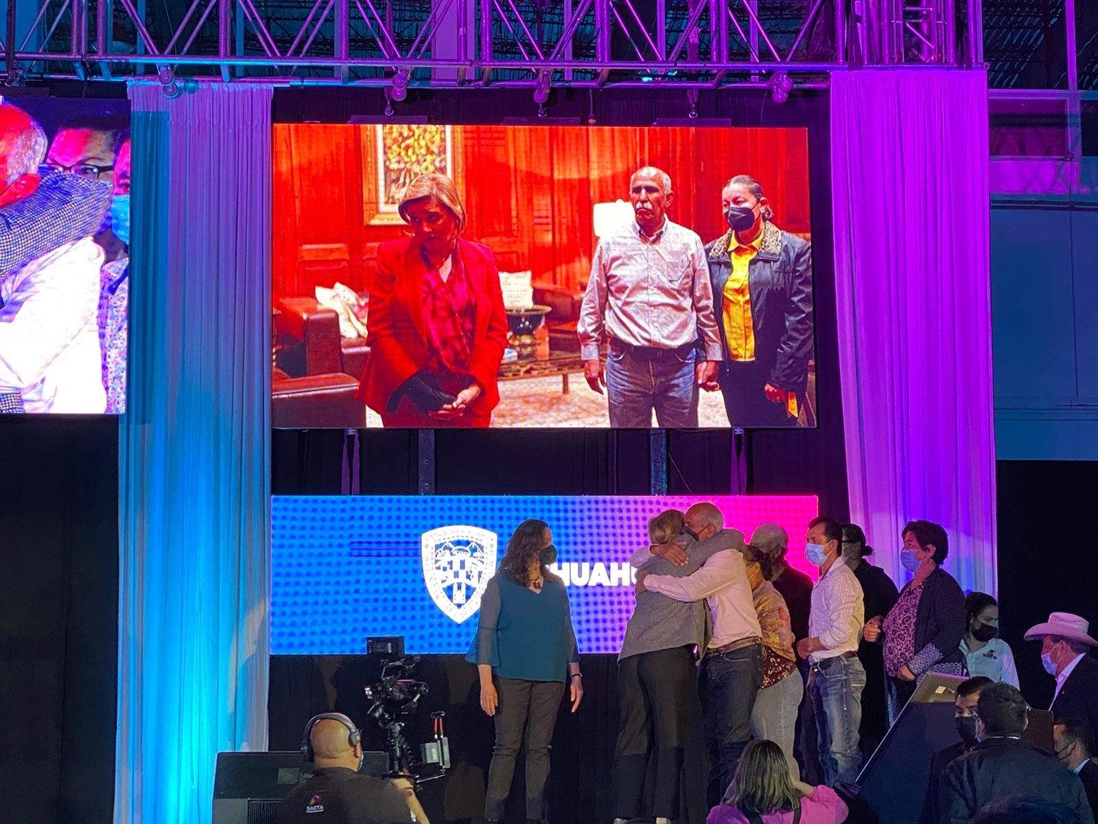 En ese momentos todos los presentes se pusieron de pie y entre aplausos subieron junto con la gobernadora los principales personajes que participaron en la defensa del agua de las presas, entre ellos Andrés Valles Valles, quién fue el último agricultor en ser puesto en libertad luego de las gestiones de Maru con el gobierno federal.