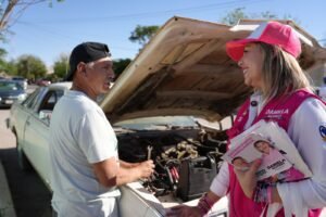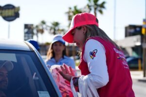 La abandera de “Fuerza y Corazón por México” también saludo a automovilistas en el crucero del boulevard Óscar Flores y calle Cordillera de los Andes, más tarde se trasladó al crucero Valle del Sol y camino Ortiz Rubio, para presentar sus propuestas a familias juarenses que transitaban por la zona.