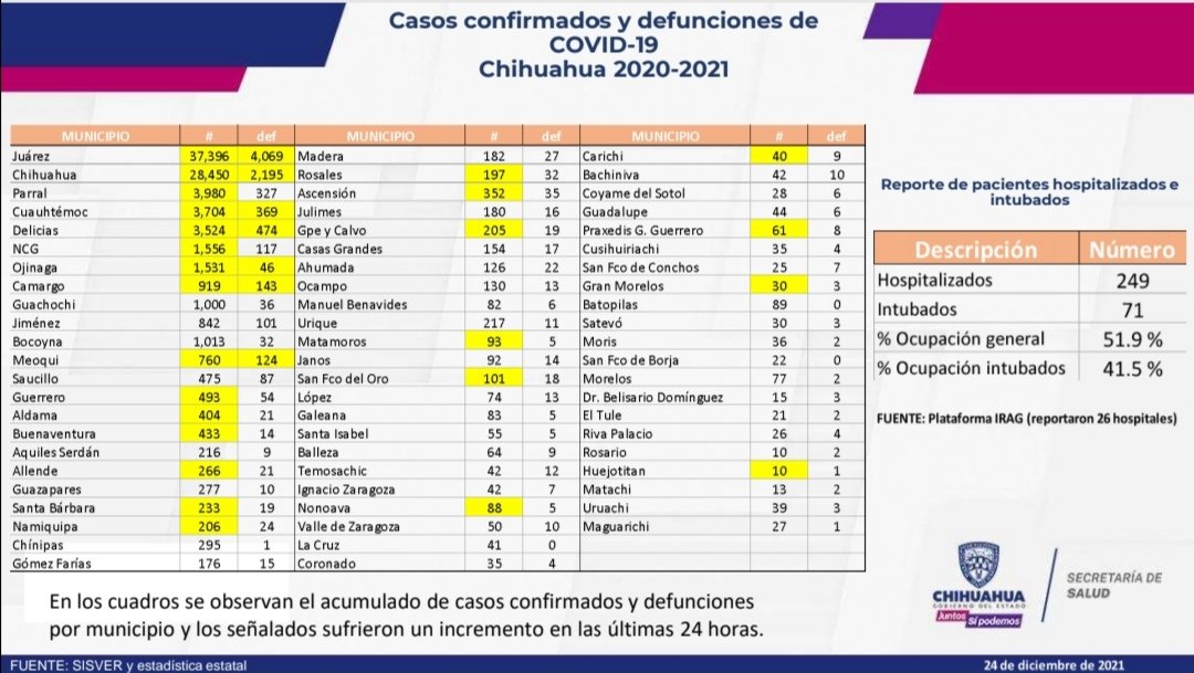El número de personas confirmadas asciende a 91 mil 554, los casos confirmados corresponden a los municipios de Juárez (+74), Chihuahua (+117), Parral (+36), Cuauhtémoc (+6), Delicias (+6), Nuevo Casas Grandes (+5), Ojinaga (+9), Camargo (+8), Meoqui (+1), Guerrero (+1), Aldama (+4), Buenaventura (+1), Allende (+2), Santa Bárbara (+1), Namiquipa (+1), Rosales (+1), Ascención (+1), Guadalupe y Calvo (+2), Matamoros (2), San Francisco del Oro (+1), Nonoava (+1), Carichí (+2), Praxedis G. Guerrero (+1), Gran Morelos (+3) y Huejotitán (+1).