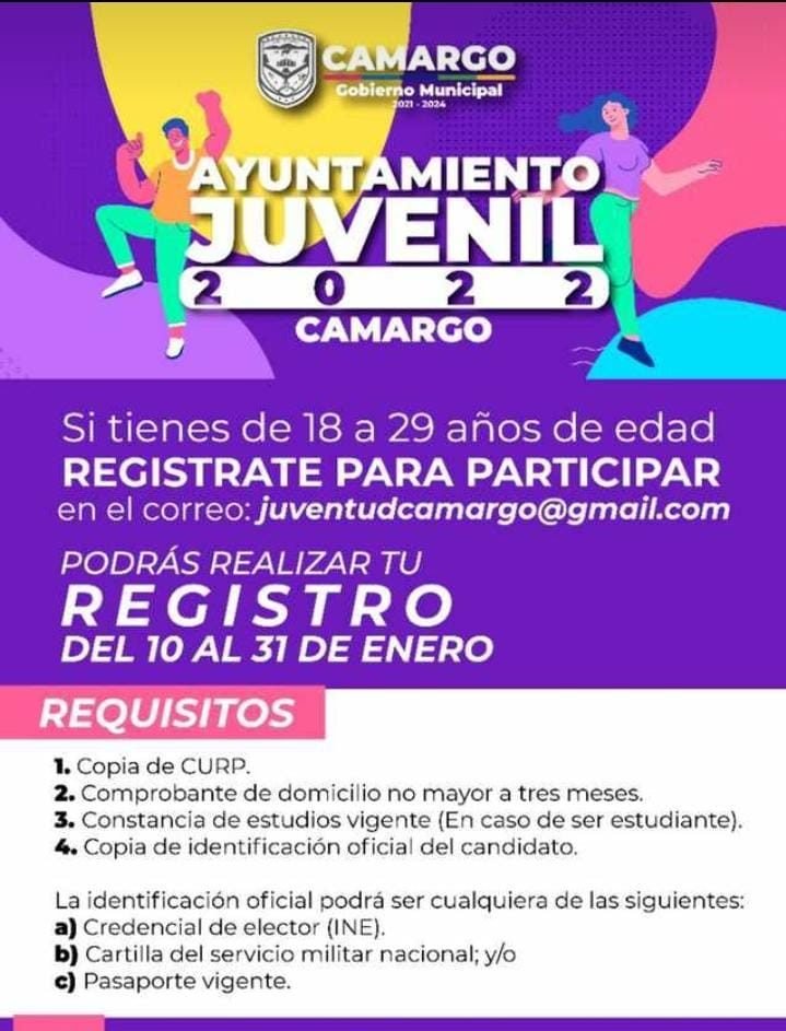 El gobierno municipal de Camargo iniciará el registro para el ayuntamiento juvenil 2022 el próximo lunes 10 de enero y estará hasta el 31 del mismo mes.