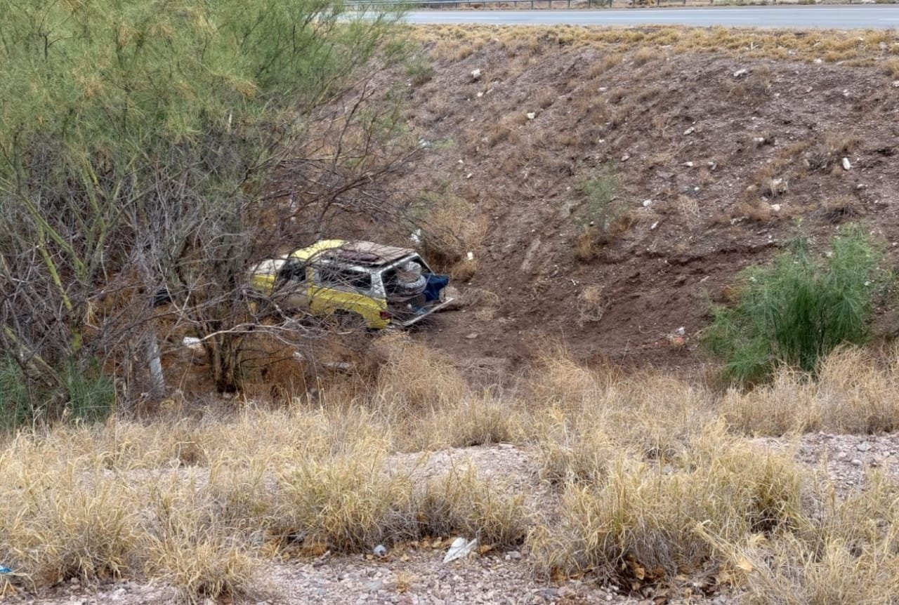 En el sitio fue localizado un automóvil de la marca Chevrolet, línea Spark, color rojo y con placas del estado de Chihuahua, el cual terminó completamente volcado sobre su toldo, con las llantas hacia arriba dentro de una canaleta ubicada entre los dos carriles, a un costado de la carretera.